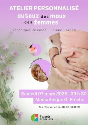 - Le samedi 7 mars à 9 h 30, les maux des femmes feront l’objet d’un atelier personnalisé animé par Véronique Bessede et Jusiane Farenq, professionnelles des médecines douces.