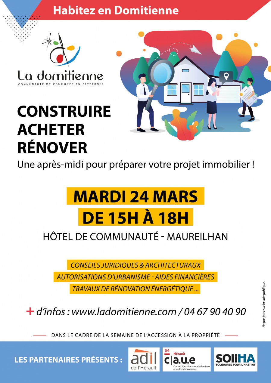Dans le cadre de la Semaine de l'accession à la propriété, La Communauté de Communes la Domitienne organise une demi-journée en direction des particuliers afin de les aider à préparer leur projet immobilier le