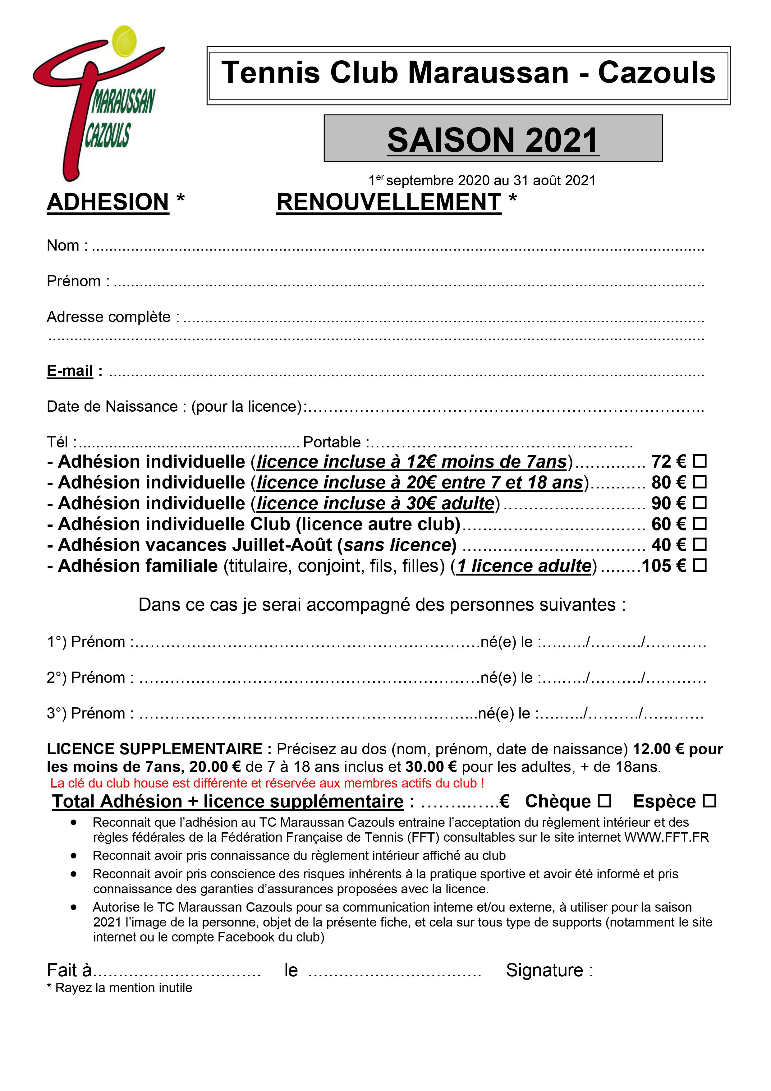 Formulaire d'inscription pour l'adhésion au club, avec licence.