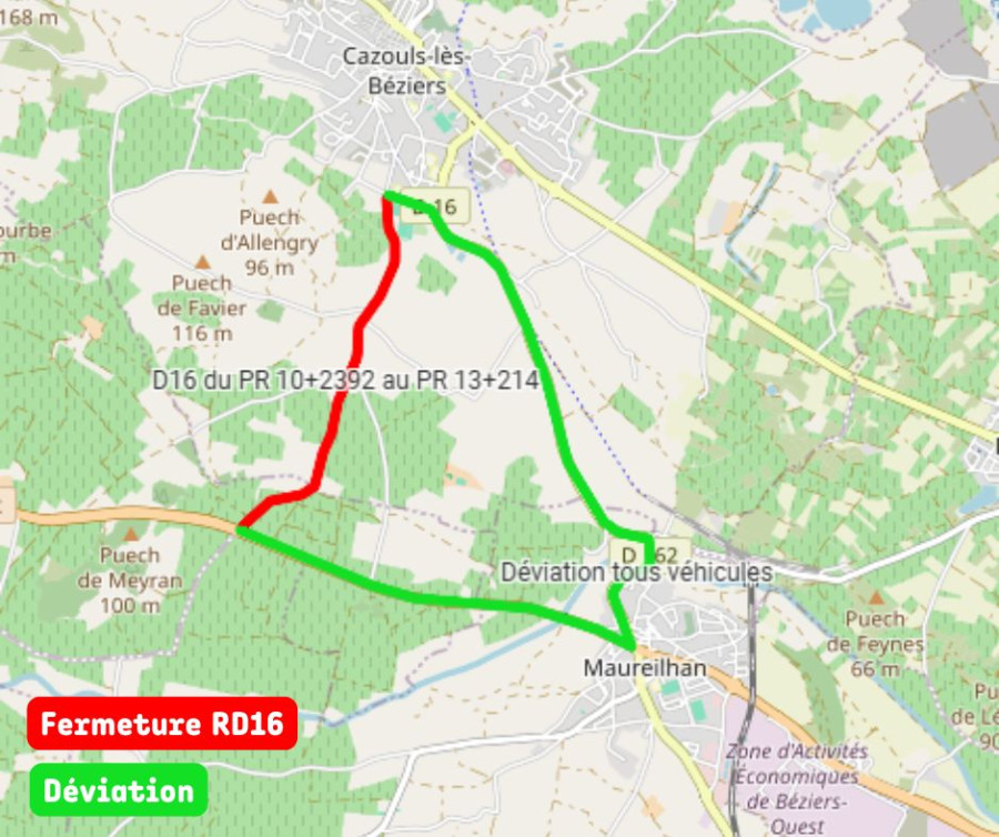 La route départementale RD16 entre les communes de Cazouls-lès-Béziers et de Puisserguier sera fermée du mercredi 19 novembre au samedi 22 novembre inclus, de 20 h 30 à 05 h 00.